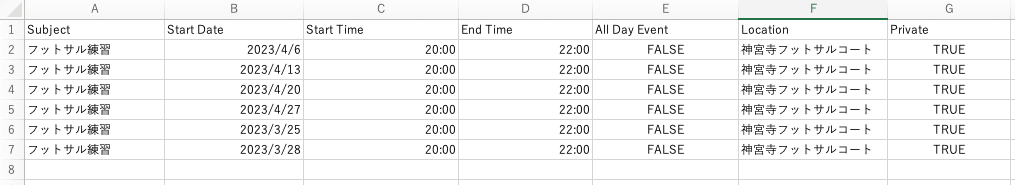 予定を書き込めたら、ファイルをCSV(コンマ区切り)で保存して Google カレンダー で読み込みます。
