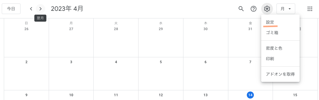 1、Google カレンダー を開き右上の歯車マークを開き「設定」をクリック