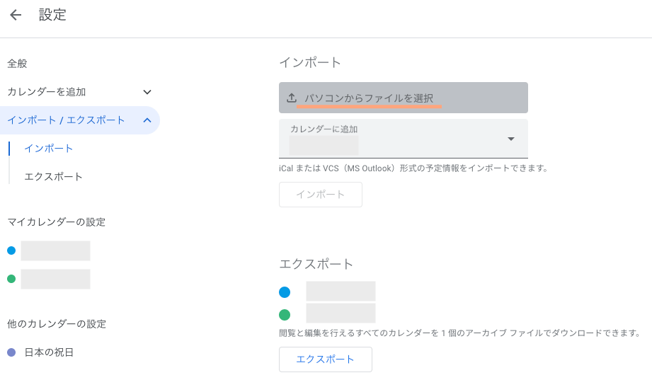 3、インポートの「パソコンからファイルを選択」から CSVファイルを読み込み、読み込みたいカレンダーがあればカレンダーを選択してインポート
